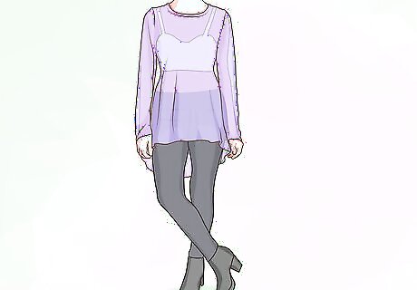 Wear the bralette under a semi-sheer sweater. Use the bralette as your shirt under the sweater. This is a good way to completely cover up but show off a little bit of your cute bralette. You can choose how see-through you’d like your sweater to be. A sweater with fairly large holes is a good option to reduce the amount of skin showing, but reveal a bit of the bralette. Put on a long, semi-sheer sweater with black pants and black boots for a day or night look.