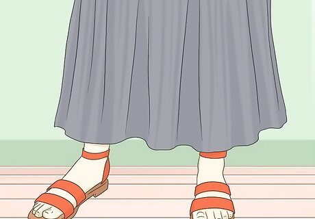 Slip on open-toed shoes for warmer weather. Keep yourself cool during a heatwave by testing out some sandals or flip-flops. If you’re trying to coordinate an outfit, opt for neutral shoe tones, like brown or beige. If you’re looking to add some color to their ensemble, try on some brightly colored sandals instead! For example, try on a pair of flat, orange sandals with a flowy gray dress to create a perfect summer look.