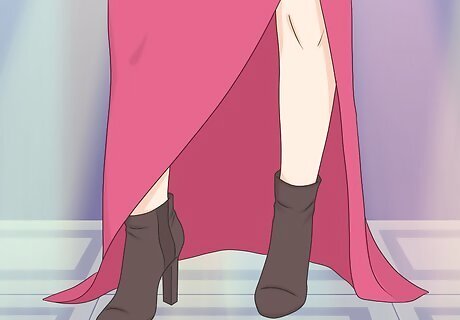Pair ankle boots with a slitted dress for a sexy look. Choose a form-fitting ankle or floor-length dress with a slit down the side. For a more revealing look, keep 1 leg covered and 1 leg uncovered. If you’re aiming for a more subtle outfit, keep both legs covered in fabric, with 1 leg slightly visible through the slit. For example, wear a bright pink dress with low pumps or high heels for a sexy party outfit.