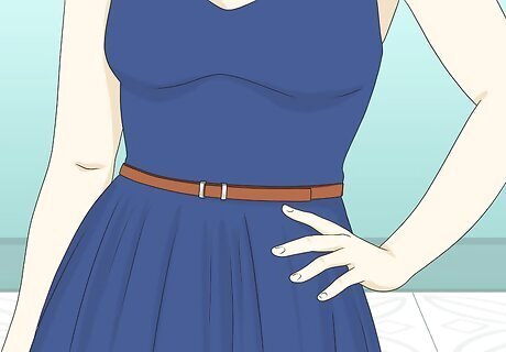 Split your dress in half with a thin belt. Add a new dimension to your dress by securing a belt around your waist. Create a stylish, on-the-go outfit by dressing in an outfit that’s not too formal, and not too casual. To really bring your outfit together, select a neutral-toned belt to complete your ensemble. For instance, pair a thin, brown belt with a long, dark dress (e.g., navy blue, black).