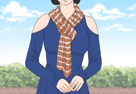 Prepare for cooler weather with a scarf. Stay warm and stylish by wrapping a long scarf around your neck. Try and choose an accessory with more neutral tones, or with colors that match your outfit. If you’re prioritizing warmth, look for scarves made out of thicker, knitted material. If you’re seeking a fashion scarf, search for accessories made with a lighter, thinner material. For example, pair a long, navy blue dress with a thick, brown and white scarf in the cooler weather.