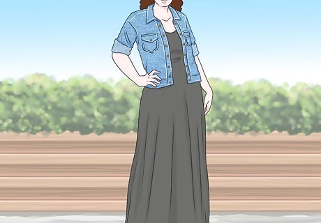 Slip on a denim jacket to make yourself look more casual. Dress down your outfit by adding some casual materials to your look. Balance elegance and informality by selecting a jacket that goes down to your waist. If the weather is especially warm, try rolling the sleeves up to your elbows. To maximize the casual look, pair your denim jacket with a neutral-toned dress. For example, wear a waist-length denim jacket with a floor-length gray dress.