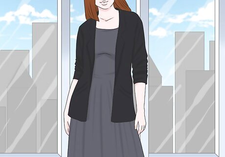 Slip on a blazer on to add some style to your work ensemble. Get ready for the office by covering your shoulders and sleeves with a professional garment. While a long dress might look out-of-place on its own in the office, you can send your outfit in a clear direction by slipping on a form-fitting blazer or suit jacket. To keep your look especially professional, try and employ dark or neutral tones in your ensemble. For example, try pairing a long, gray dress with a black blazer and a nice set of flats.