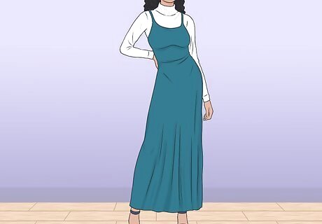 Pull on a long-sleeved shirt beneath a maxi dress to create a comfortable outfit. Compromise the formal undertones of your maxi dress by slipping on a turtleneck or other long-sleeved shirt beneath the top portion of your short-sleeved or sleeveless dress. Choose a shirt that matches the color scheme of your maxi dress to create a fashionable and coherent ensemble. For instance, if you’re wearing a sleeveless teal and blue maxi dress, consider wearing a white turtleneck underneath.