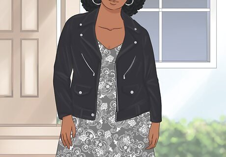 Go for an informal look with a leather jacket. Stay relaxed in a long dress by slipping on a casual and laid back jacket. With this type of accessory, you can create a fun contrast between your outerwear and your dress. Experiment with different color schemes and dress patterns until you find something that fits your personal style! For example, try pairing a gray and white patterned dress with a black biker jacket. To top off the look, slide on a pair of sunglasses, too!