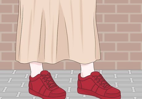 Wear flat sneakers to give your outfit a casual vibe. Prepare for a day out on the town by slipping on some trainers or converse before heading out. If you’re planning on walking a lot but don’t want to sacrifice your long dress, select a pair of shoes that are easy and comfortable to walk in. If you have brightly colored sneakers, see if any of them match your dress of choice! For instance, pair a long, beige dress with bright red sneakers to add a burst of color to your look.