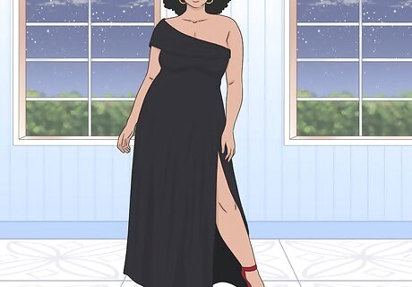 Opt for 1 shoulder strap to go for an edgy look. Follow some formal fashion trends by slipping on a dress with a single sleeve or strap. If you don’t have an asymmetrical dress on hand, try adjusting 1 sleeve so that it falls further down your arm. Asymmetrical gowns look especially striking in bold colors, like royal blue and canary yellow. If you’d like to go for a more subtle look, try on a black gown instead.