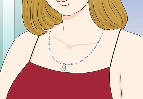 Get ready to go out by slipping on a long necklace. Add a touch of elegance to any outfit by adding a tasteful necklace. Depending on the exact dress, you might want to experiment with different styles and colors of jewelry until you find a combination that you like. For neutral-toned dresses, test out a silver necklace. If your outfit follows a certain color scheme, choose jewelry that matches some of those shades. For instance, a silver necklace would go well with a solid black dress, while a chunky pink and white necklace would look great with a light pink dress.