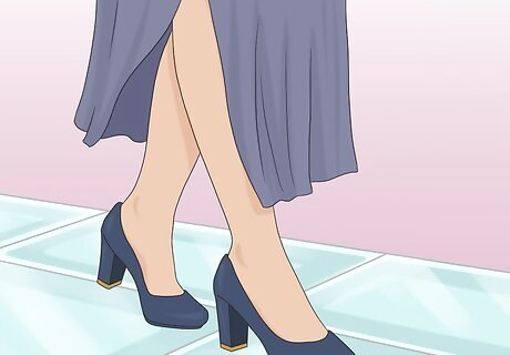 Pick out some low pumps to add elegance to your ensemble. Bridge the gap between flats and high heels by trying on a pair of lower heels. If you’re going to a formal event or party, pumps can add a small amount of height to your look without making it difficult to walk. Try experimenting with different neutral shoe tones until you find a pair that goes well with your long dress! For example, create a chic outfit by pairing a dark or neutral-toned dress with a set of round-toe pumps.