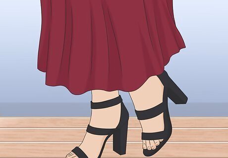 Choose a pair of heels to add some height to your outfit. Make yourself look a little taller by slipping on a pair of stilettos or high-heeled sandals. If you prefer a closed-toe style, opt for high-heeled boots instead. If you’re planning on walking a lot, try to pick out shoes with a more manageable height. For instance, pair an ankle-length dress with a set of black, high-heeled sandals.