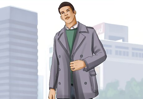 Invest in a long peacoat for a more formal look. Long men’s peacoats often have 8-10 buttons, and provide a more formal look. You might choose this style if you wear suits often because it adds dimension to your outfit. Make sure your jacket still hits above your knees to avoid making your legs look unusually short. You can wear a long peacoat with most business and formal wear, including suits, slacks, button up-shirts with ties, and sweater vests.