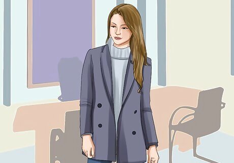Layer your peacoat atop a knit turtleneck sweater for added warmth. If you’re wearing a short dress or skirt in the autumn or winter, you can layer up with a colored turtleneck and peacoat on top. You’ll still look great while baring your legs, but you won’t be as cold in the chilly air. Be careful, a turtleneck and peacoat with jeans might make you look bulky. If you’re planning on wearing pants, you might opt for a lighter sweater.