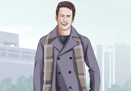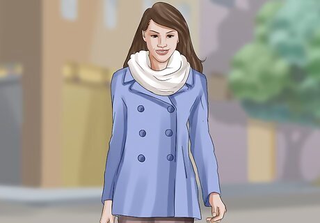 Pair the coat with a complementary scarf for put-together look. For autumn and winter, the scarf is a natural accessory for your peacoat. You can choose one in a fun color like green or red, or a pattern that incorporates the color of your jacket with other colors. For a casual look, leave your scarf undone and let it drape over the front of your jacket. For a more formal look, tie the scarf in a simple knot and tuck it into the front of your coat. This will keep you warm and make you look coordinated.