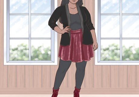 Add a blazer to a velvet skater skirt for a cold-weather event. This is a bold vibe that asks people to look at you. A fitted blazer gives a chic, finished look while an oversized one is trendier. Add patterned tights and shoes or boots to finish the outfit.