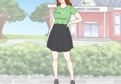 Pair your skater skirt with a tee and Converse for an ultra-casual look. Lightweight shirts tend to go best with the skater skirt’s bouncy feel and fitted tees look better with skater skirts than boxy ones. The sneakers dress the skirt down without taking away any of its fun. If sneakers are too warm, flip-flops will have a similar effect on your overall look. You can tuck your t-shirt to create a more balanced outfit. Another great option is to tie your t-shirt or to use a crop top to create more waist definition.