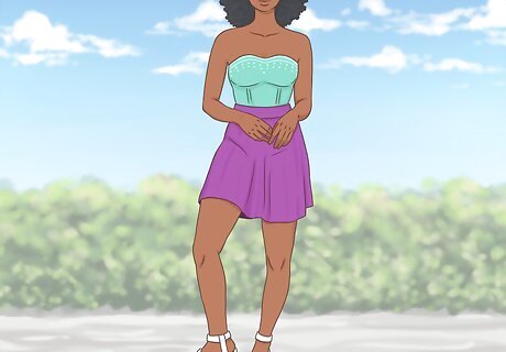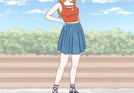 Choose a cute bustier with your skater skirt for a beachy vibe. Going to the beach or want to look like you were just there? Pair a plain bustier with a flowered skater skirt or an embellished bustier with a neutral one. You can also wear a bralette top if you are feeling brave. If you aren’t comfortable in a bustier, a strappy tank top can have a similar effect.