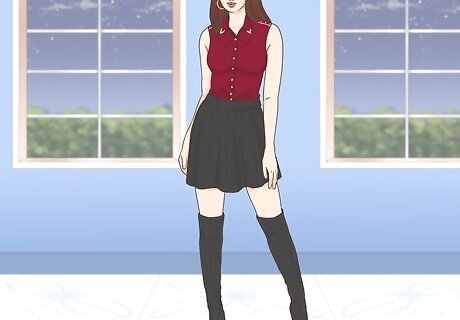 Wear a dressy top and tall boots for a party. You can wear almost any color top with a neutral skater skirt, or choose a neutral top with a bright, flashy skirt. Collared blouses look great with skater skirts, as do sleeveless tops with decorative ruching. Adding knee-high boots adds instant glam, and above-the-knee boots offer a sexy, svelte look. Add knee-high socks or tights for an even more formal look. Coordinate your tights with your shirt for an added pop.