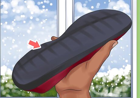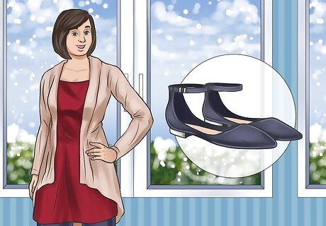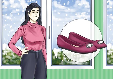 Look for flats with straps or a buckle. Having straps or a buckle on the flats will make it easier for you to walk or run around outside during winter. You may opt for flats with stylish ties or straps that go over your ankle. Or you may buy flats with a buckle across your ankle to keep them in place. You can search for flats with straps or buckles online. You can also look for flats in this style in shoe stores. Try the flats on before you buy them to make sure the straps or buckles do not irritate your skin or squeeze your ankle.