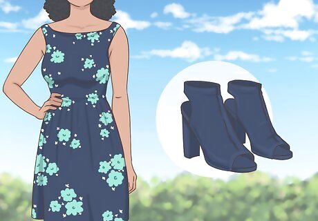 Stick with solid open-toed booties if your outfit has a lot of detail. Your shoes should complement your outfit, not distract from it. If you have a lot going on in the rest of your outfit, stick to open-toed booties that are a solid color. For instance, if you’re wearing a shirt with sequins and black slim-fitting ankle pants, you might wear all-black booties. Similarly, if you’re wearing a dress with a bold floral print, you’d probably opt for a solid-colored shoe in a color that complements the dress.