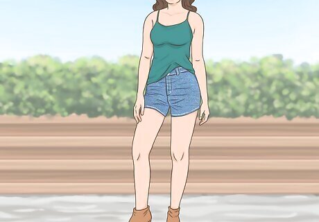 Glam up your off-day style by wearing your booties with a tank and shorts. There’s nothing more casual than a tank top or a T-shirt and a pair of shorts. However, if you want to mix comfort and style, slip on your peep-toe booties with your favorite shorts, then toss on a casual top. You’ll be ready to take on anything the day throws at you! This works better with structured shorts made from a material like khaki or denim. Avoid wearing your booties with super-casual shorts, like gym shorts or shorts made from terrycloth or sweatshirt material. For the most put-together look, opt for a slim-fitting tank or T-shirt, rather than something super baggy. Style your hair in long waves, a messy bun, or a casual ponytail for this look. Keep your makeup minimal—think mascara and lip balm—if you wear any at all.