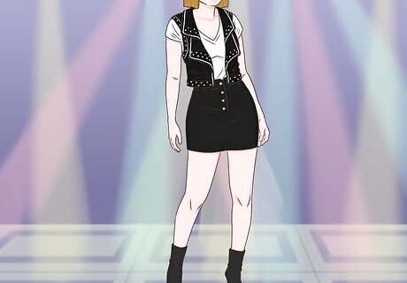 Wear open-toed booties with a skirt, a T-shirt, and a vest for a chic look. For a look that’s super-cute without being too dressy, wear your favorite skirt with a fitted T-shirt and a cool vest. You can create endless variations on this look, from tough to bohemian, depending on how you style it. For example, you could wear this outfit with a black miniskirt, black booties, and a black leather vest for a look that’s tough yet feminine. Accessorize with a crossbody bag, straight hair, and a smokey eye. Opt for a floral ankle-length skirt, white T-shirt, flowy vest, and bold-colored booties for a summery boho-chic look. You could also wear a maxi dress and a vest to create this look, if you prefer. Finish your outfit with a straw hat, messy waves, and neutral makeup.
