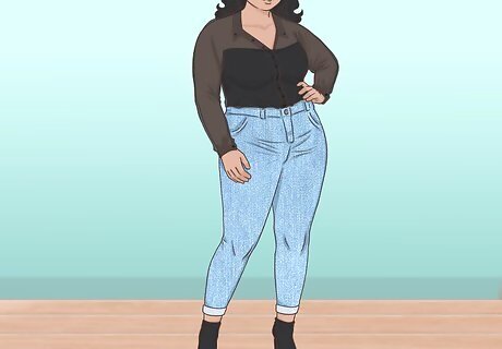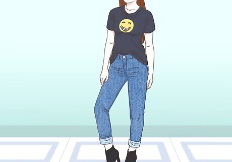 Cuff a pair of relaxed jeans at your ankle to show off your booties. Relaxed, boyfriend-style jeans are a great weekend staple, but they can look very casual. Add a little style by rolling them up 2-3 times so they hit just at your ankle, then wear your open-toed booties and your favorite top. If your jeans won’t stay cuffed, try ironing them. This is a great way to dress up a pair of boyfriend jeans and your favorite band tee. Keep your eye makeup minimal and rock a dark red lip with stick-straight hair for a look that channels the 90s in a modern way.
