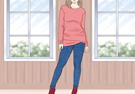 Wear your booties with a midi-length dress for a look that’s glam but demure. Midi-length skirts and dresses hit anywhere from just below your knee to about halfway down your calf. This look is modest and appropriate for almost anywhere, but it can look a little dowdy if it’s not styled right. Luckily, an open-toed pair of booties is just the on-trend touch to keep you looking fresh and modern. Wear your hair in a messy fishtail braid and go glam with dramatic lashes and a matte lip to look youthful and put-together.