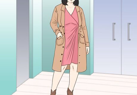 Channel your inner boss by wearing booties with a trenchcoat and dress. Layering a long, fitted trenchcoat over a flowy dress is always a pretty look. When you add a pair of open-toed booties, you’ll be ready to take on anything that comes your way! Just make sure all of the colors you pick complement each other. For instance, you could wear a khaki-colored trench, a pale pink chiffon dress, and camel-colored booties. Then, pull your hair into a messy chignon, and wear a neutral eye, soft rose-colored blush, and a neutral lip for an elegant finish.