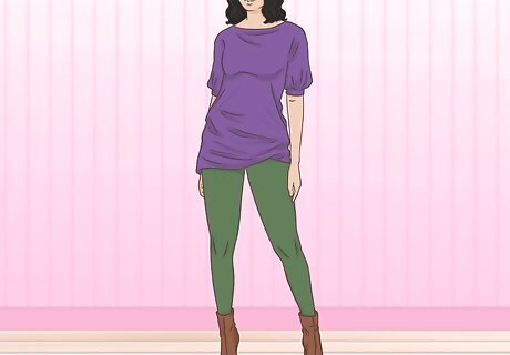 Wear your booties with leggings and a tunic top to look cute and comfortable. Leggings are the ultimate way to stay comfortable, and they’re always cute when you wear them with a long top. Toss on your peep-toe booties to add an extra dash of style to this cozy outfit. Just make sure your top is long enough to cover your bottom to make sure you've dressed appropriately. For example, if you have a pair of brown open-toed booties, you might wear a plum-colored tunic, olive-green leggings, and your boots. You could carry an oversized bag, style your hair in beachy waves, and wear plum eyeliner to tie the look together.