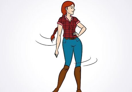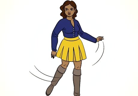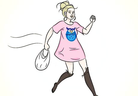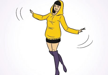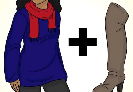 Wear leggings and a long sweater. Over-the-knee boots, a long, sweater, and boots is a classic fall look. Keep the look very casual by minimizing the accessories and wearing flat boots. To dress it up a little, wear high heel boots and accessories, like a scarf and frilly socks, with your outfit. If you’re wearing leggings, wear a sweater that comes down to your thighs.