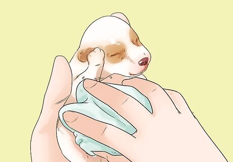 Clean the puppies off. When the puppies are born, they will be covered in a thin membrane – the placental sac – which their mother should remove by licking it off. However, if the mother is too engaged in pacing and concentrating on her labor, you might need to intervene and remove the placental sac yourself. If your dog has not removed its pup’s placental sac after a few seconds, take a damp cloth and gently rub the puppy’s face. This approximates the natural licking behavior of the pup’s mother that should remove the sac. If the sac remains on the pup too long, it might suffocate. Once the sac is off, the pup will be wet with placental fluid. Use a clean, warm towel to dry the puppy off, making fast rubbing motions along the length of its body to help warm the puppies up as well.