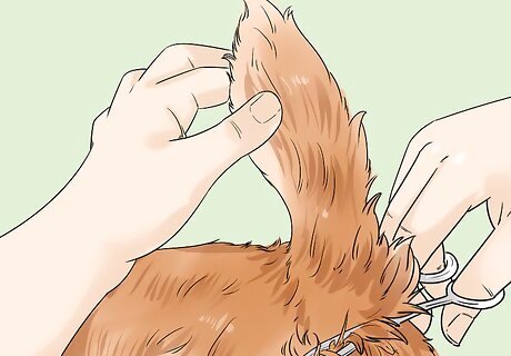 Give your dog a trim. Birth is always messy. Whelping means not only new puppies, but amniotic fluid, placental sacs, and umbilical cords, all of which have their own unique juices. These birth liquids are difficult to get out of matted dog hair. You can easily avoid the unpleasant task of scrubbing your dog’s rear legs and tail by trimming the hair in that area at least a few days before labor is expected. Use your knowledge of how far along your dog is in its pregnancy to determine when to trim it. Remove hair in the area of the vulva, the rear legs, and tail. If your dog has a lot of long hair, you may want to consider shaving her belly or trimming around the nipples to make it easier on the puppies.