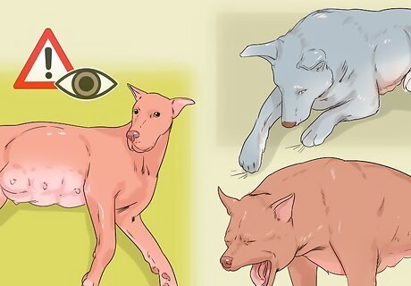 Look for signs that your dog is in labor. In the early stages of labor, your dog might pace, shiver, dig, or vomit. This might last six to 12 hours, after which your dog’s amniotic sac – a gray balloon-like bulb, also known as the placental sac – will emerge from your dog’s vulva. The sac will appear small at first, then grow in size. Eventually the dog’s puppies will slide into this sac, at which point the mother will nibble at it to deflate it.
