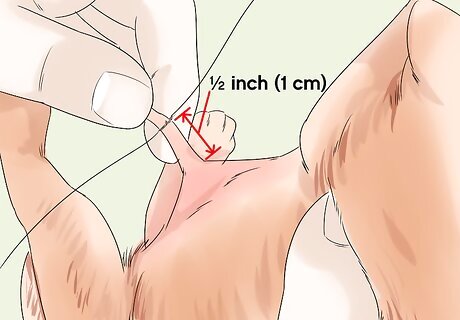 Snip the umbilical cord. The umbilical cord is a long cord that connects the uterus of the mother to the abdomen of its puppy. During the mother dog’s pregnancy, the umbilical cord provides food and nutrients to the growing puppy. After the pup is born, however, the umbilical cord is no longer needed. The mother dog should gnaw at the cord until it is severed, but if she doesn’t you should be ready to help. To snip the umbilical cord, measure ½ an inch (1 centimeter) away from the puppy’s body, and tie it with thread or unwaxed floss. This will narrow the diameter of the cord, making it easier to cut. Then, use a sharp pair of shears and cut straight through it. If the cord bleeds, tie it with a suture. The two portions will shrivel up and drop off in time.
