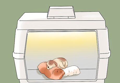 Move puppies to an incubation chamber. You can easily craft a makeshift incubation chamber by placing a heating pad in the bottom of a laundry basket or medium-sized cardboard box, then placing a heavy blanket over the heating pad. As your dog births puppies, remove them to the incubation chamber until your dog is no longer in labor. Large breed dogs, especially, may accidentally stomp on their own puppies while pacing about in the whelping box during labor. Removing puppies to an incubation chamber is, for that reason, especially important. Try not to overcrowd the incubation chamber. If necessary, create another. Try to keep no more than two puppies together in one chamber.