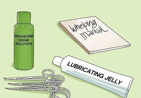 Assemble some emergency supplies. In case your dog has trouble getting its puppies out and going to the vet isn’t an option, you should be ready to intervene on your dog’s behalf. Collect three or four pairs of sterile hemostat forceps, sutures, a tube of lubricating jelly, a small bottle of povidone iodine solution, and your whelping manual. Additionally, try to have a more experienced friend present or watch videos about whelping so you know if your dog needs intervention. These common medical supplies can be obtained online or at your local pharmacy. Forceps might need to be obtained through a larger big-box store or through your local medical supply company. In the event that you need to remove a pup from your dog, consult your whelping manual or call your vet and have them walk you through it. You might also want to get a book or deck of cards for yourself so you have something to do while waiting for your dog to deliver.