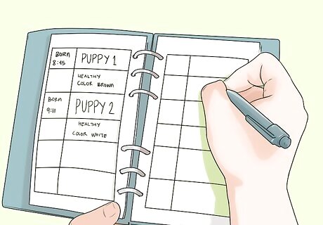 Note the details of the births. When your new puppies come out, you’ll need to keep track of who’s who. Note all the details associated with the birth in a journal or chart. Assign each puppy a number (i.e., Pup 1, Pup 2, Pup 3…), the time they were born, their sex, weight, and any marking you might have made (some people like to dab a small bit of colored, nontoxic nail polish on their puppies to keep track of which is which). Most importantly of all, make sure that after each puppy is born, the placenta comes out. The placenta is an organ that provides nutrients and eliminates waste of unborn animals. If the mother does not eject the placenta after giving birth, she can get very ill. Normally, the placenta will immediately come out after the puppy is born and the mother will consume it. But sometimes the placenta might not eject right away, and sometimes the mother might not eat all the placenta. It’s possible that your dog will bear two puppies and then eject two placenta. Use the chart to mark down when the placenta come out and contact your vet if your dog does not eject all its placenta. As your puppies grow over the next couple of weeks, use the chart to monitor their weight. Their weights might decrease slightly immediately after birth, but by the end of the week they should weigh twice as much as they did when they were born. If they do not, contact your vet.