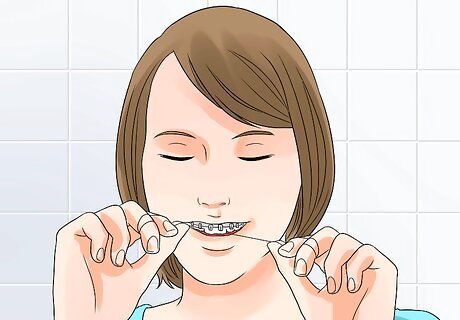 Floss your teeth once a day. This can be difficult when you have braces. Thread the floss under the wires of your braces. Then floss as you normally would, making sure you get deep into the spaces between your teeth. It may take some time for you to get used to flossing with braces, but it's important that you continue to take this step. Keeping your teeth flossed is essential for having white teeth. Food and other debris caught between your teeth can cause decay and discoloration. In addition, you can develop gingivitis or other gum diseases. If you have any difficulty getting the floss underneath your wires, you can use a floss threader. These are very inexpensive and are available at most pharmacies.
