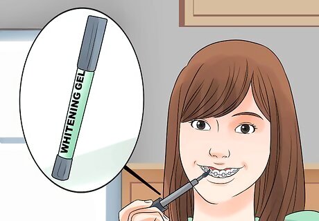Try paint-on whitening gels. These products are available without a prescription at most pharmacies. These paint-on gels don't have the seal of approval from the ADA as effective teeth whitening products. These products require you to paint a bleaching gel onto your teeth that then hardens within 30 minutes. To remove the gel, you simply brush your teeth. These can be hard to apply around brackets and wires if you have braces. These gels contain lower concentrations of hydrogen peroxide than in-office or dentist prepared options. Paint-on bleaching gels don't have the same effectiveness as tray treatments. Results may vary from person to person.