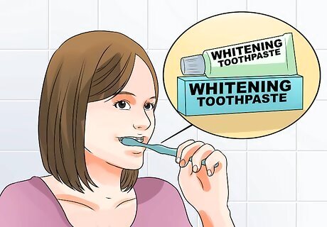 Consider using whitening toothpastes. Look for brands that are American Dental Association (ADA) approved, because they contain fluoride: a mineral essential for dental health. Whitening toothpastes contain special abrasives such as baking soda and peroxide to remove surface stains from teeth. However, these products will only remove surface stains. They will not change the color of your enamel entirely. Whitening toothpastes won't cause any problems for people with braces. The abrasives in the toothpaste won't cause any breakdown of cement or wear on your wires.
