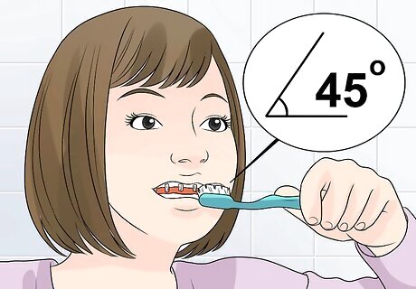 Brush your teeth carefully. Start by putting a pea-sized amount of whitening toothpaste on your brush. You don't need a huge amount of toothpaste to clean your teeth! Dentists recommend a round-ended toothbrush with soft bristles. Electric or sonic toothbrushes are preferable since they do a more thorough job; however, you may still need an interdental toothbrush to clean around your brackets. Place your toothbrush at a 45-degree angle to the gums. Gently brush in side to side strokes. Be sure to brush the front, back, biting surfaces of all of your teeth. Brushing your teeth should take at least two to three minutes. If you have any stubborn areas around your brackets and wires, you can use a cone-shaped (interdental) toothbrush. Most orthodontists and dentists will be able to supply you with these. These brushes are small and are designed to fit under the wires of braces. If your braces are shiny and all parts of the brackets are visible, you have done a good job. Brush your teeth this way after each meal.