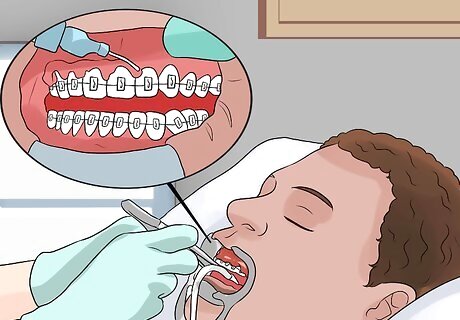 Consider in-office professional whitening treatments. These are the quickest and most effective treatments for whitening. During these treatments your dentist will put a protective gel on your gums and put an oral shield on your mouth to protect your gums and cheeks. They will then apply a bleaching agent to your teeth around your braces. Typically, these are made of varying concentrations of strong hydrogen peroxide. Most in-office treatments will use a special light to activate the bleaching solution, though other treatments are available using in-office bleaching trays.