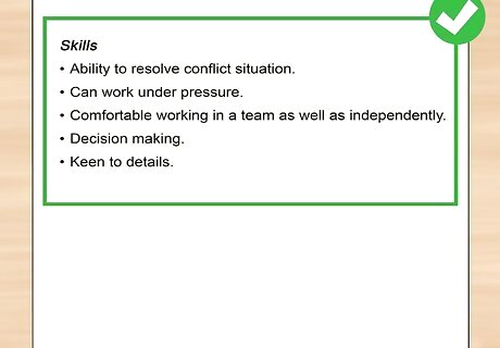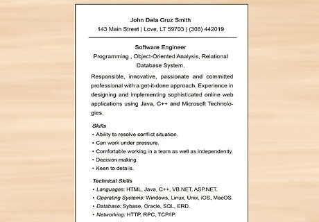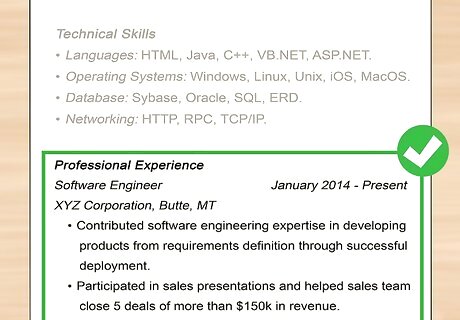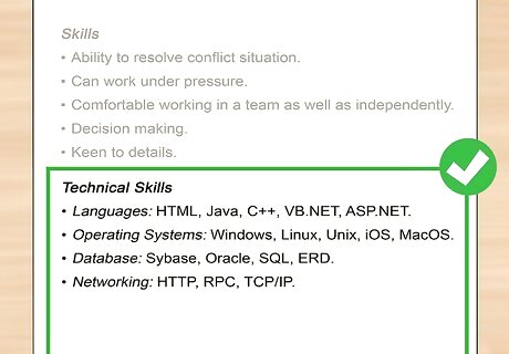List the names of technologies and programming languages you’ve used. Microsoft recruiters will search for candidates based on specific keywords that are relevant to the position. List all technologies, programming languages, and other tools you’ve used in a skills section on your resume. For example, if a specific position requires a candidate to use Java programming, a recruiter may search for resumes with "Java" in the body of the resume. You should tailor this skills section to each job that you apply for, and leave off non-relevant skills to avoid clutter.
