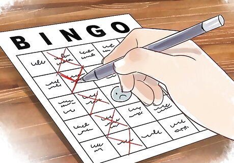 Create a bingo game out of your worries. Another way to relieve your worries is to make them into a game. Make bingo cards with all of your worries and stresses on them. This will help you detach from your worries a little and help you focus on something else. For example, have a block for a reward to a less hard working coworker, criticism from your boss, or a rude customer. Whenever your worries and stresses come up, cover up that space. When you completed a whole line, give yourself an award.