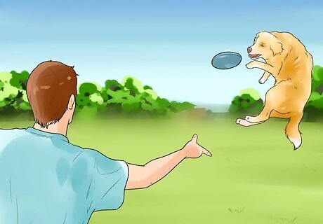 Allow your dog to exercise. Ensure that your dog gets plenty of exercise that is appropriate to his breed and size. Most dogs show more appropriate behavior when taken for a brisk walk twice a day. Dogs that are naturally more energetic or breeds that are accustomed to being working dogs may require more physical activity. Some activities that will encourage your dog to exercise include playing fetch, hiking, jogging (use caution when attempting to acclimate your dog to long jogs), and swimming. Allowing a dog to fetch a Frisbee or ball in a large (preferably fenced) open area where he can run can give him good exercise for both his body and his brain. Talk to your vet about how to safely incorporate new exercise into your dog's routine, particularly if the dog has not had much exercise in the past.