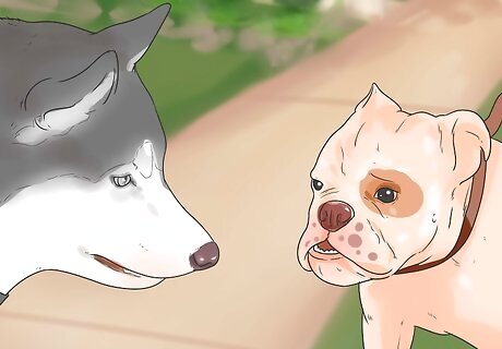 Train your dog to stop acting aggressive toward other dogs. If your dog exhibits aggressive or inappropriate behavior when meeting another dog in public, you should neither reward nor punish his behavior. Petting your dog to comfort him rewards the behavior, while punishing him may increase his anxiety or confusion. Instead, you should retrain the habit by using a friend with an amiable dog. Have your friend stand with her dog at the end of your street, and gradually begin to walk towards them. When your dog sees the other dog in the distance, have him sit and reward him for sitting nicely. Signal for your friend to bring her dog a bit closer. Reward your dog for continuing to sit nicely. Repeat the signal and allow your friend’s dog to come closer and closer while your dog continues to sit. Work for 5-10 minutes, and then give your dog a rest for the day. The next day, begin the 5-10 minute session at the distance that the previous day left off. Eventually, your dog should become desensitized to the closeness of other dogs. If your dog reacts to your friend’s dog inappropriately (by leaving the sit command and beginning to bark or growl, for instance), walk him the other direction and resume the training a little further apart.