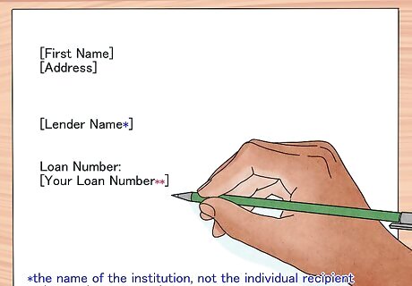 Put the proper heading on your letter. There is no set format for addressing your letter. However, it is important that your letter gets to the right place in the lender's organization and that they have enough information to access your loan information. To make sure you include all of the required information, consider using the following format: On your first line, write your full name. Go down a line and write your address on the next two lines (the second and third lines). Write in your lender's name (the name of institution, not the individual recipient). Skip another line, then write "Loan number:" and then your loan number. This number can be found on your loan contract.