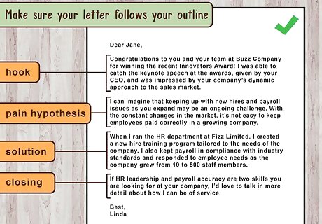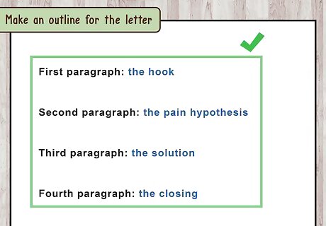 Make an outline for the letter. Pain letters follow a four part structure. The letter should be no longer than one page long, with four short paragraphs. Make an outline for the letter with the following sections: First paragraph: the hook. In the first paragraph, you will grab the reader’s attention and make it clear you have researched the company or organization. Second paragraph: the pain hypothesis. In the second paragraph, you will address the hiring manager’s pain. Third paragraph: the solution. In the third paragraph, you will discuss your solution to the pain. Fourth paragraph: the closing. In the fourth paragraph, you will wrap up the letter concisely and confidently.