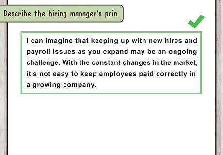 Describe the hiring manager’s pain. In the second paragraph, focus on one pain the hiring manager may be having. Refer to the issues mentioned in the job description. Do not try to address every pain point. Instead, focus on just one so your letter is clear and to the point. For example, you may write, “I can imagine that keeping up with new hires and payroll issues as you expand may be an ongoing challenge. With the constant changes in the market, it’s not easy to keep employees paid correctly in a growing company.” In this section, do not tell the hiring manager what to do or how to do their job. Simply outline a possible pain point that you feel you can address or offer solutions for.