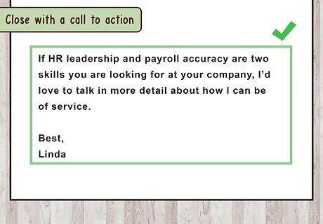 Close with a call to action. End the letter with a short one to two sentence closing paragraph. Briefly note the pain you have addressed in the letter as well as a gentle call to action about getting in touch with the hiring manager. Include a friendly sign off. For example, you may write, “If HR leadership and payroll accuracy are two skills you are looking for at your company, I’d love to talk in more detail about how I can be of service. Best, [your name].”